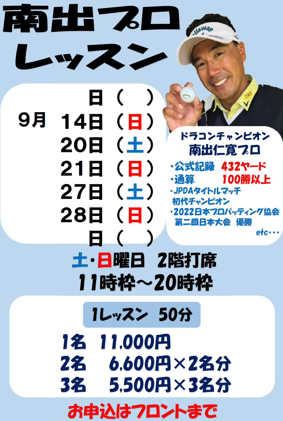 9月は以下のスケージュルで南出プロレッスンの開催を予定しております。