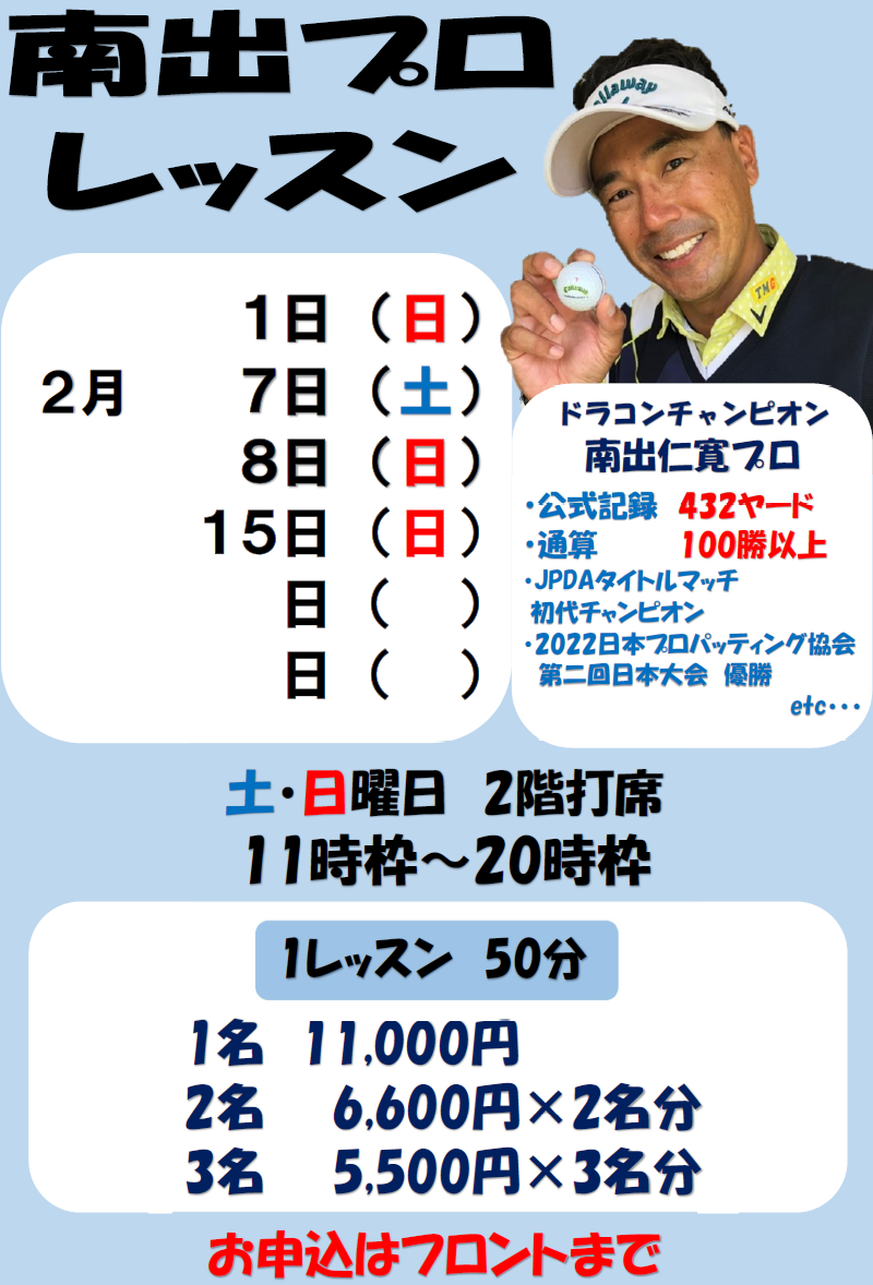2月は以下のスケージュルで南出プロレッスンの開催を予定しております。