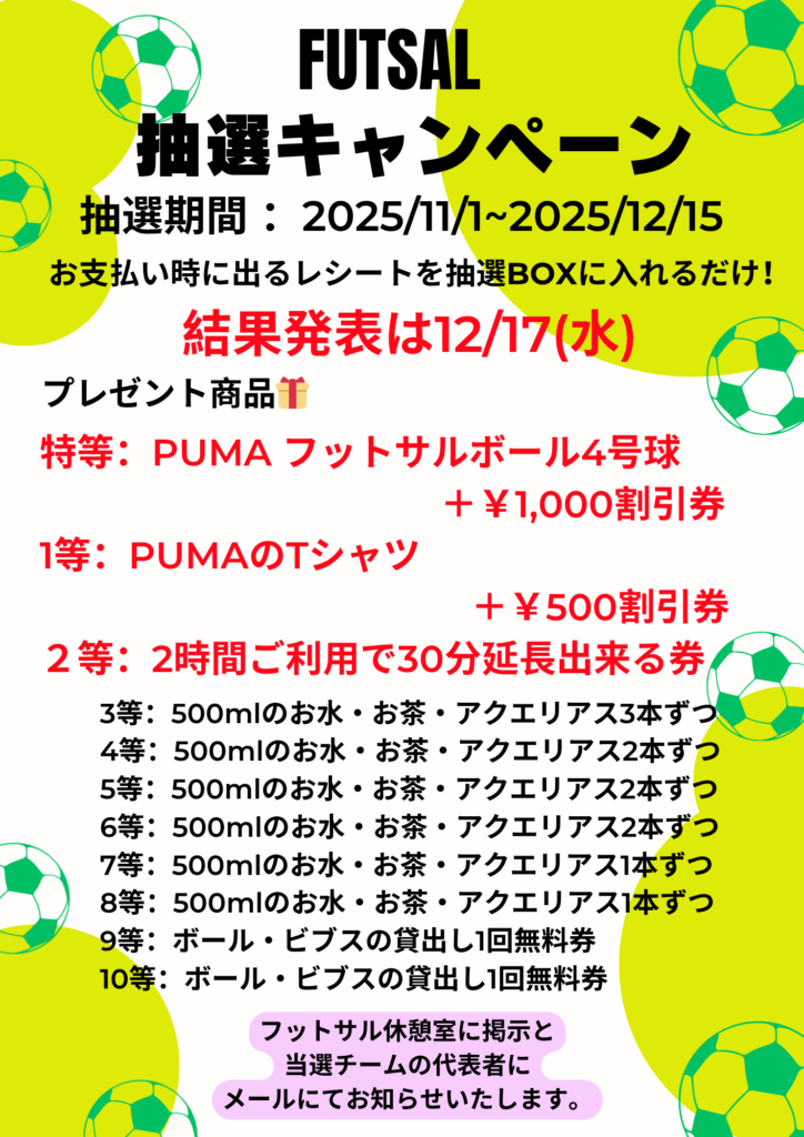 11月1日から12月15日までフットサル⚽抽選会開催!