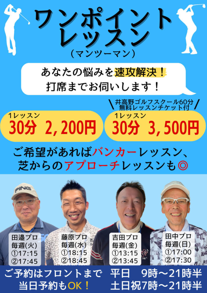 | 料金(税込) | ①30分 2,200円 ②井高野ゴルフスクール無料レッスンチケット付き 30分 3,500円 ※打席・練習ボールは ご自身でご用意下さい |