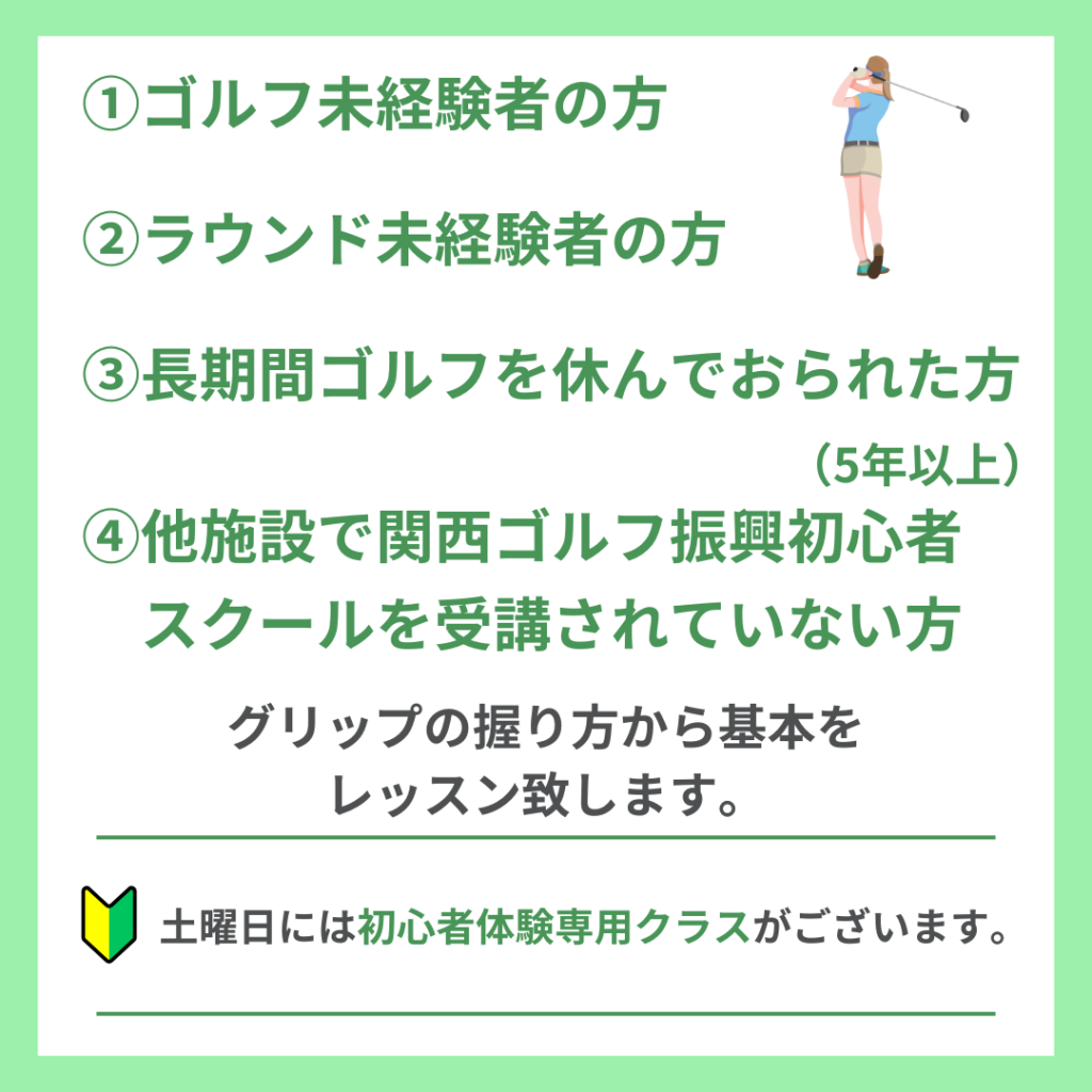 | 対象 | 成人・社会人の方 ※ゴルフ未経験者の方、ラウンド未経験者の方、長期間ゴルフを休んでおられた方(5年以上)、 他施設で関西ゴルフ振興初心者スクールを受講されていない方に限ります。 |