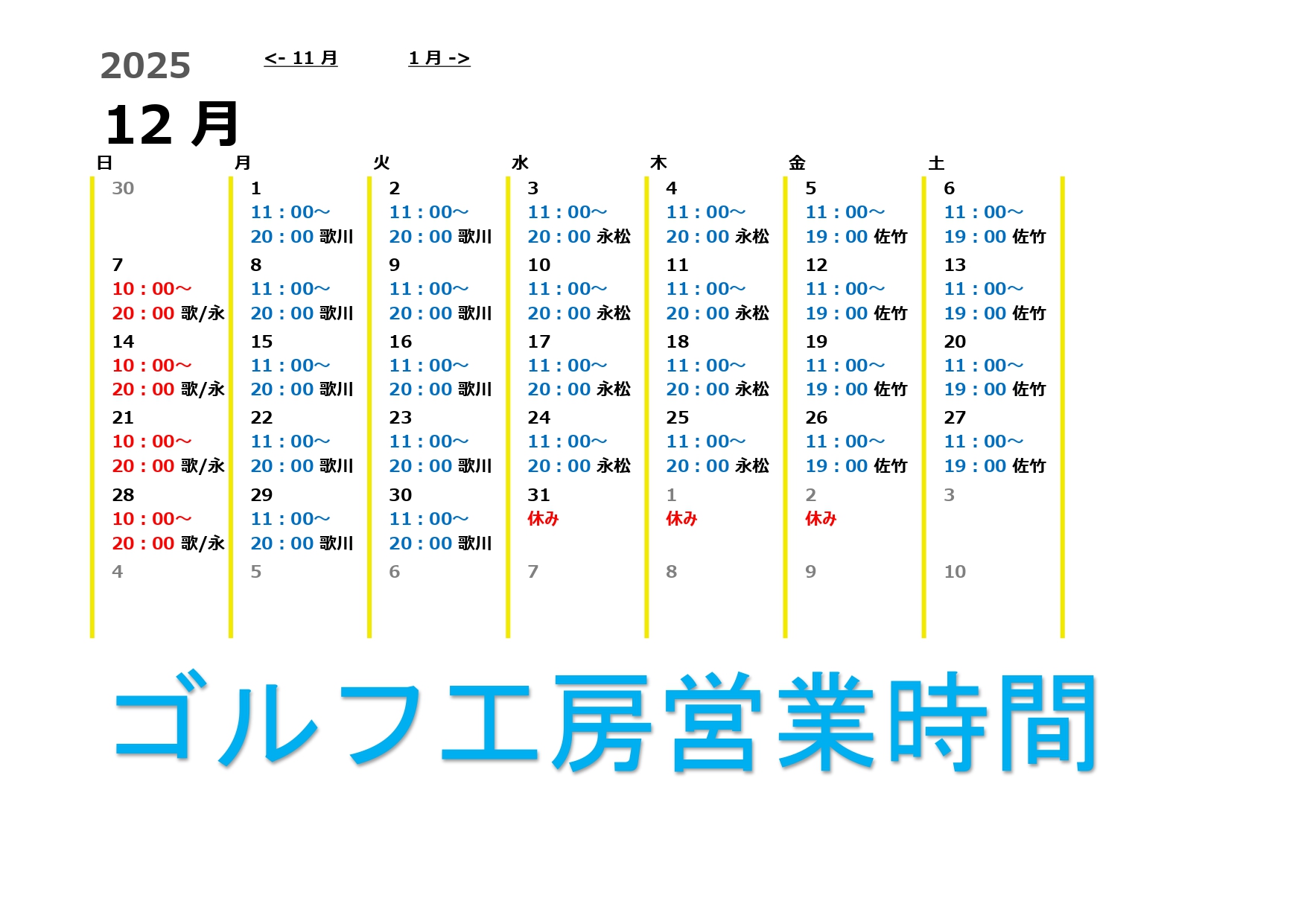2025年12月 工房営業時間のお知らせ 2025 8/28 ゴルフショップ・工房 施設からのお知らせ グリップ交換、スリーブ交換、シャフト交換、ロフトライ角調整も承っております。 ご来店お待ちしております。 ゴルフショップ・工房 施設からのお知らせ URLをコピーしました!